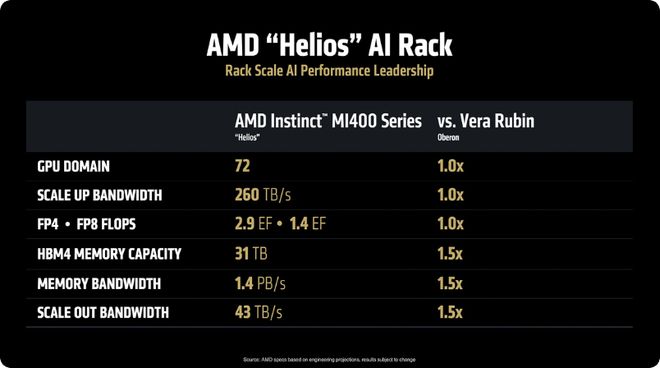 在今年6月的ADVANCING AI 2025大会上,AMD发布了下一代AI GPU的预告,表示将打造代号为“Helios”的AI机架系统,其中包括了代号“Venice”的新一代EPYC服务器处理器、Instinct MI400系列计算卡、以及代号“VULCANO”的新一代网卡